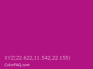 XYZ 22.622,11.542,22.155 Color is a normal magenta color and the nearest color is Red Violet #c71585. Hex code #b21382 and RGB value is rgb(178,19,130). In RGB color space, this color is composed of 70% red, 7% green, 51% blue, In CMYK color space, this color is composed of 0% cyan, 89% magenta, 27% yellow , 30% black , In HSL color space, this color has a hue angle of 318° , 81% saturation and 39% lightness.