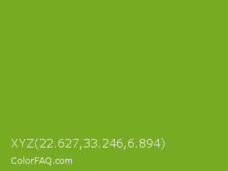 XYZ 22.627,33.246,6.894 Color is a normal green color and the nearest color is Lima #76bd17. Hex code #78ab24 and RGB value is rgb(120,171,36). In RGB color space, this color is composed of 47% red, 67% green, 14% blue, In CMYK color space, this color is composed of 30% cyan, 0% magenta, 79% yellow , 33% black , In HSL color space, this color has a hue angle of 83° , 65% saturation and 41% lightness.