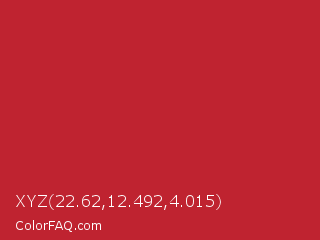 XYZ 22.62,12.492,4.015 Color is a normal red color and the nearest color is Cardinal #c41e3a. Hex code #bf2330 and RGB value is rgb(191,35,48). In RGB color space, this color is composed of 75% red, 14% green, 19% blue, In CMYK color space, this color is composed of 0% cyan, 82% magenta, 75% yellow , 25% black , In HSL color space, this color has a hue angle of 355° , 69% saturation and 44% lightness.