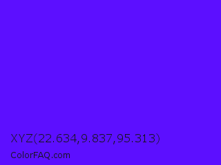 XYZ 22.634,9.837,95.313 Color is a normal indigo color and the nearest color is Han Purple #5218fa. Hex code #5c0fff and RGB value is rgb(92,15,255). In RGB color space, this color is composed of 36% red, 6% green, 100% blue, In CMYK color space, this color is composed of 64% cyan, 94% magenta, 0% yellow , 0% black , In HSL color space, this color has a hue angle of 259° , 100% saturation and 53% lightness.