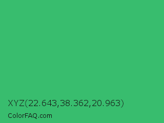 XYZ 22.643,38.362,20.963 Color is a normal green color and the nearest color is Medium Sea Green #3cb371. Hex code #38bd6e and RGB value is rgb(56,189,110). In RGB color space, this color is composed of 22% red, 74% green, 43% blue, In CMYK color space, this color is composed of 70% cyan, 0% magenta, 42% yellow , 26% black , In HSL color space, this color has a hue angle of 144° , 54% saturation and 48% lightness.