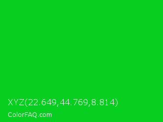 XYZ 22.649,44.769,8.814 Color is a normal green color and the nearest color is Vivid Malachite #00cc33. Hex code #06cf20 and RGB value is rgb(6,207,32). In RGB color space, this color is composed of 2% red, 81% green, 13% blue, In CMYK color space, this color is composed of 97% cyan, 0% magenta, 85% yellow , 19% black , In HSL color space, this color has a hue angle of 128° , 94% saturation and 42% lightness.