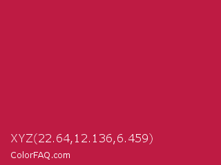 XYZ 22.64,12.136,6.459 Color is a normal red color and the nearest color is Maroon Flush #c32148. Hex code #be1b43 and RGB value is rgb(190,27,67). In RGB color space, this color is composed of 75% red, 11% green, 26% blue, In CMYK color space, this color is composed of 0% cyan, 86% magenta, 65% yellow , 25% black , In HSL color space, this color has a hue angle of 345° , 75% saturation and 43% lightness.