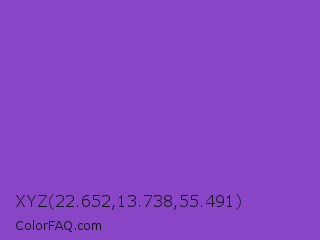 XYZ 22.652,13.738,55.491 Color is a normal purple color and the nearest color is Fuchsia Blue #7a58c1. Hex code #8846c7 and RGB value is rgb(136,70,199). In RGB color space, this color is composed of 53% red, 27% green, 78% blue, In CMYK color space, this color is composed of 32% cyan, 65% magenta, 0% yellow , 22% black , In HSL color space, this color has a hue angle of 271° , 54% saturation and 53% lightness.
