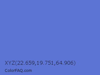 XYZ 22.659,19.751,64.906 Color is a normal blue color and the nearest color is Indigo #4f69c6. Hex code #5c75d4 and RGB value is rgb(92,117,212). In RGB color space, this color is composed of 36% red, 46% green, 83% blue, In CMYK color space, this color is composed of 57% cyan, 45% magenta, 0% yellow , 17% black , In HSL color space, this color has a hue angle of 228° , 58% saturation and 60% lightness.