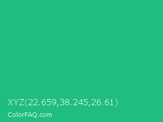XYZ 22.659,38.245,26.61 Color is a normal green color and the nearest color is Mountain Meadow Crayola #1ab385. Hex code #1fbd80 and RGB value is rgb(31,189,128). In RGB color space, this color is composed of 12% red, 74% green, 50% blue, In CMYK color space, this color is composed of 84% cyan, 0% magenta, 32% yellow , 26% black , In HSL color space, this color has a hue angle of 157° , 72% saturation and 43% lightness.