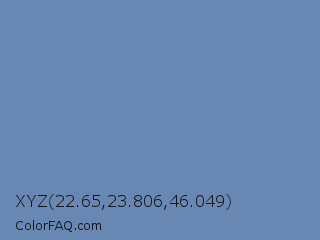 XYZ 22.65,23.806,46.049 Color is a normal blue color and the nearest color is Glaucous #6082b6. Hex code #6888b3 and RGB value is rgb(104,136,179). In RGB color space, this color is composed of 41% red, 53% green, 70% blue, In CMYK color space, this color is composed of 42% cyan, 24% magenta, 0% yellow , 30% black , In HSL color space, this color has a hue angle of 214° , 33% saturation and 55% lightness.