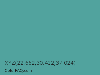 XYZ 22.662,30.412,37.024 Color is a normal cyan color and the nearest color is Breaker Bay #5da19f. Hex code #51a39e and RGB value is rgb(81,163,158). In RGB color space, this color is composed of 32% red, 64% green, 62% blue, In CMYK color space, this color is composed of 50% cyan, 0% magenta, 3% yellow , 36% black , In HSL color space, this color has a hue angle of 176° , 34% saturation and 48% lightness.