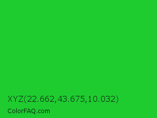 XYZ 22.662,43.675,10.032 Color is a normal green color and the nearest color is Lime Green #32cd32. Hex code #1ecc30 and RGB value is rgb(30,204,48). In RGB color space, this color is composed of 12% red, 80% green, 19% blue, In CMYK color space, this color is composed of 85% cyan, 0% magenta, 76% yellow , 20% black , In HSL color space, this color has a hue angle of 126° , 74% saturation and 46% lightness.