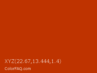 XYZ 22.67,13.444,1.4 Color is a normal orange color and the nearest color is Mahogany #c04000. Hex code #bf3300 and RGB value is rgb(191,51,0). In RGB color space, this color is composed of 75% red, 20% green, 0% blue, In CMYK color space, this color is composed of 0% cyan, 73% magenta, 100% yellow , 25% black , In HSL color space, this color has a hue angle of 16° , 100% saturation and 37% lightness.