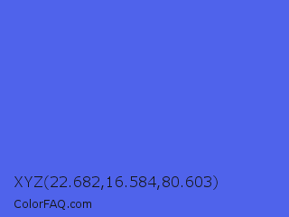 XYZ 22.682,16.584,80.603 Color is a light blue color and the nearest color is Ultramarine Blue #4166f5. Hex code #4f63eb and RGB value is rgb(79,99,235). In RGB color space, this color is composed of 31% red, 39% green, 92% blue, In CMYK color space, this color is composed of 66% cyan, 58% magenta, 0% yellow , 8% black , In HSL color space, this color has a hue angle of 232° , 80% saturation and 62% lightness.