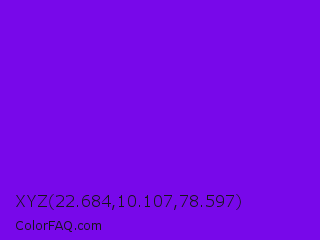 XYZ 22.684,10.107,78.597 Color is a normal violet color and the nearest color is Violet Color Wheel #7f00ff. Hex code #7808ea and RGB value is rgb(120,8,234). In RGB color space, this color is composed of 47% red, 3% green, 92% blue, In CMYK color space, this color is composed of 49% cyan, 97% magenta, 0% yellow , 8% black , In HSL color space, this color has a hue angle of 270° , 93% saturation and 47% lightness.
