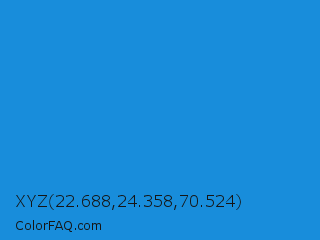 XYZ 22.688,24.358,70.524 Color is a normal blue color and the nearest color is Curious Blue #2596d1. Hex code #188ddb and RGB value is rgb(24,141,219). In RGB color space, this color is composed of 9% red, 55% green, 86% blue, In CMYK color space, this color is composed of 89% cyan, 36% magenta, 0% yellow , 14% black , In HSL color space, this color has a hue angle of 204° , 80% saturation and 48% lightness.