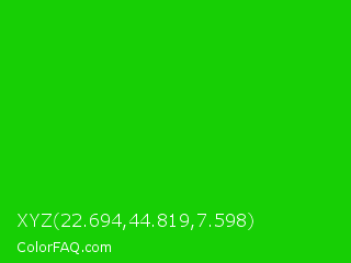 XYZ 22.694,44.819,7.598 Color is a normal green color and the nearest color is Harlequin Green #46cb18. Hex code #17cf05 and RGB value is rgb(23,207,5). In RGB color space, this color is composed of 9% red, 81% green, 2% blue, In CMYK color space, this color is composed of 89% cyan, 0% magenta, 98% yellow , 19% black , In HSL color space, this color has a hue angle of 115° , 95% saturation and 42% lightness.