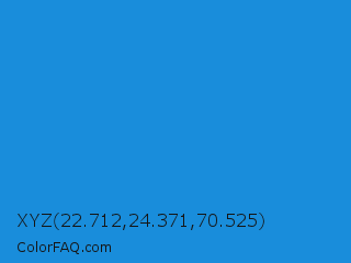 XYZ 22.712,24.371,70.525 Color is a normal blue color and the nearest color is Curious Blue #2596d1. Hex code #198ddb and RGB value is rgb(25,141,219). In RGB color space, this color is composed of 10% red, 55% green, 86% blue, In CMYK color space, this color is composed of 89% cyan, 36% magenta, 0% yellow , 14% black , In HSL color space, this color has a hue angle of 204° , 80% saturation and 48% lightness.