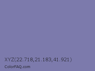 XYZ 22.718,21.183,41.921 Color is a normal indigo color and the nearest color is Shadow Blue #778ba5. Hex code #7c7aac and RGB value is rgb(124,122,172). In RGB color space, this color is composed of 49% red, 48% green, 67% blue, In CMYK color space, this color is composed of 28% cyan, 29% magenta, 0% yellow , 33% black , In HSL color space, this color has a hue angle of 242° , 23% saturation and 58% lightness.