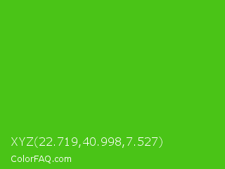 XYZ 22.719,40.998,7.527 Color is a normal green color and the nearest color is Harlequin Green #46cb18. Hex code #4ac417 and RGB value is rgb(74,196,23). In RGB color space, this color is composed of 29% red, 77% green, 9% blue, In CMYK color space, this color is composed of 62% cyan, 0% magenta, 88% yellow , 23% black , In HSL color space, this color has a hue angle of 102° , 79% saturation and 43% lightness.