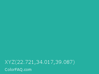 XYZ 22.721,34.017,39.087 Color is a normal cyan color and the nearest color is Light Sea Green #20b2aa. Hex code #25b0a1 and RGB value is rgb(37,176,161). In RGB color space, this color is composed of 15% red, 69% green, 63% blue, In CMYK color space, this color is composed of 79% cyan, 0% magenta, 9% yellow , 31% black , In HSL color space, this color has a hue angle of 174° , 65% saturation and 42% lightness.