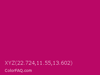 XYZ 22.724,11.55,13.602 Color is a normal rose color and the nearest color is Lipstick #ab0563. Hex code #ba0766 and RGB value is rgb(186,7,102). In RGB color space, this color is composed of 73% red, 3% green, 40% blue, In CMYK color space, this color is composed of 0% cyan, 96% magenta, 45% yellow , 27% black , In HSL color space, this color has a hue angle of 328° , 93% saturation and 38% lightness.