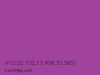XYZ 22.732,13.908,33.385 Color is a normal magenta color and the nearest color is Purpureus #9a4eae. Hex code #a1429d and RGB value is rgb(161,66,157). In RGB color space, this color is composed of 63% red, 26% green, 62% blue, In CMYK color space, this color is composed of 0% cyan, 59% magenta, 2% yellow , 37% black , In HSL color space, this color has a hue angle of 303° , 42% saturation and 45% lightness.