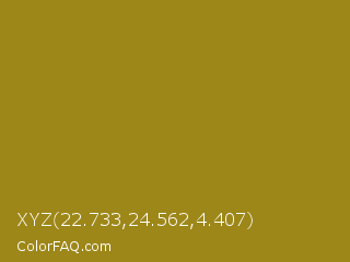 XYZ 22.733,24.562,4.407 Color is a normal yellow color and the nearest color is Reef Gold #9f821c. Hex code #9d8718 and RGB value is rgb(157,135,24). In RGB color space, this color is composed of 62% red, 53% green, 9% blue, In CMYK color space, this color is composed of 0% cyan, 14% magenta, 85% yellow , 38% black , In HSL color space, this color has a hue angle of 50° , 73% saturation and 35% lightness.