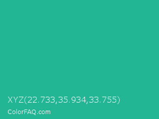 XYZ 22.733,35.934,33.755 Color is a normal cyan color and the nearest color is Mountain Meadow #30ba8f. Hex code #22b694 and RGB value is rgb(34,182,148). In RGB color space, this color is composed of 13% red, 71% green, 58% blue, In CMYK color space, this color is composed of 81% cyan, 0% magenta, 19% yellow , 29% black , In HSL color space, this color has a hue angle of 166° , 69% saturation and 42% lightness.