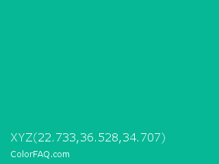 XYZ 22.733,36.528,34.707 Color is a normal cyan color and the nearest color is Persian Green #00a693. Hex code #07b896 and RGB value is rgb(7,184,150). In RGB color space, this color is composed of 3% red, 72% green, 59% blue, In CMYK color space, this color is composed of 96% cyan, 0% magenta, 18% yellow , 28% black , In HSL color space, this color has a hue angle of 168° , 93% saturation and 37% lightness.