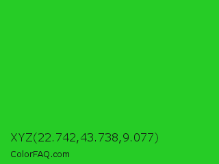 XYZ 22.742,43.738,9.077 Color is a normal green color and the nearest color is Lime Green #32cd32. Hex code #26cc26 and RGB value is rgb(38,204,38). In RGB color space, this color is composed of 15% red, 80% green, 15% blue, In CMYK color space, this color is composed of 81% cyan, 0% magenta, 81% yellow , 20% black , In HSL color space, this color has a hue angle of 120° , 69% saturation and 47% lightness.