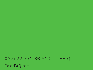 XYZ 22.751,38.619,11.885 Color is a normal green color and the nearest color is Apple #4fa83d. Hex code #52bd45 and RGB value is rgb(82,189,69). In RGB color space, this color is composed of 32% red, 74% green, 27% blue, In CMYK color space, this color is composed of 57% cyan, 0% magenta, 63% yellow , 26% black , In HSL color space, this color has a hue angle of 114° , 48% saturation and 51% lightness.