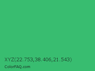 XYZ 22.753,38.406,21.543 Color is a normal green color and the nearest color is Medium Sea Green #3cb371. Hex code #38bd70 and RGB value is rgb(56,189,112). In RGB color space, this color is composed of 22% red, 74% green, 44% blue, In CMYK color space, this color is composed of 70% cyan, 0% magenta, 41% yellow , 26% black , In HSL color space, this color has a hue angle of 145° , 54% saturation and 48% lightness.