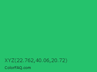 XYZ 22.762,40.06,20.72 Color is a normal green color and the nearest color is Green Crayola #1cac78. Hex code #25c26c and RGB value is rgb(37,194,108). In RGB color space, this color is composed of 15% red, 76% green, 42% blue, In CMYK color space, this color is composed of 81% cyan, 0% magenta, 44% yellow , 24% black , In HSL color space, this color has a hue angle of 147° , 68% saturation and 45% lightness.