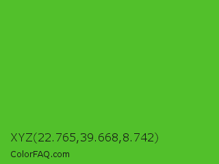 XYZ 22.765,39.668,8.742 Color is a normal green color and the nearest color is Kelly Green #4cbb17. Hex code #52c02b and RGB value is rgb(82,192,43). In RGB color space, this color is composed of 32% red, 75% green, 17% blue, In CMYK color space, this color is composed of 57% cyan, 0% magenta, 78% yellow , 25% black , In HSL color space, this color has a hue angle of 104° , 63% saturation and 46% lightness.