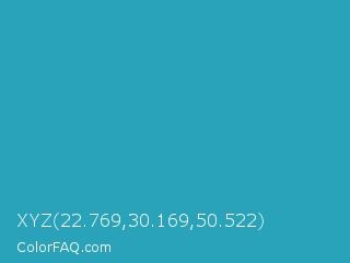 XYZ 22.769,30.169,50.522 Color is a normal cyan color and the nearest color is Eastern Blue #1e9ab0. Hex code #29a3b9 and RGB value is rgb(41,163,185). In RGB color space, this color is composed of 16% red, 64% green, 73% blue, In CMYK color space, this color is composed of 78% cyan, 12% magenta, 0% yellow , 27% black , In HSL color space, this color has a hue angle of 189° , 64% saturation and 44% lightness.