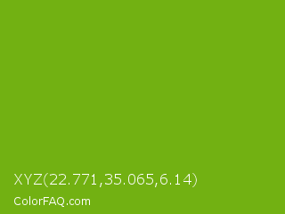 XYZ 22.771,35.065,6.14 Color is a normal green color and the nearest color is Lima #76bd17. Hex code #72b112 and RGB value is rgb(114,177,18). In RGB color space, this color is composed of 45% red, 69% green, 7% blue, In CMYK color space, this color is composed of 36% cyan, 0% magenta, 90% yellow , 31% black , In HSL color space, this color has a hue angle of 84° , 82% saturation and 38% lightness.