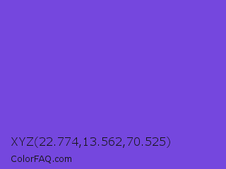XYZ 22.774,13.562,70.525 Color is a normal indigo color and the nearest color is Majorelle Blue #6050dc. Hex code #7547de and RGB value is rgb(117,71,222). In RGB color space, this color is composed of 46% red, 28% green, 87% blue, In CMYK color space, this color is composed of 47% cyan, 68% magenta, 0% yellow , 13% black , In HSL color space, this color has a hue angle of 258° , 70% saturation and 57% lightness.