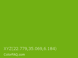 XYZ 22.779,35.069,6.184 Color is a normal green color and the nearest color is Lima #76bd17. Hex code #72b113 and RGB value is rgb(114,177,19). In RGB color space, this color is composed of 45% red, 69% green, 7% blue, In CMYK color space, this color is composed of 36% cyan, 0% magenta, 89% yellow , 31% black , In HSL color space, this color has a hue angle of 84° , 81% saturation and 38% lightness.