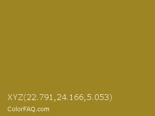 XYZ 22.791,24.166,5.053 Color is a normal yellow color and the nearest color is Reef Gold #9f821c. Hex code #9e8523 and RGB value is rgb(158,133,35). In RGB color space, this color is composed of 62% red, 52% green, 14% blue, In CMYK color space, this color is composed of 0% cyan, 16% magenta, 78% yellow , 38% black , In HSL color space, this color has a hue angle of 48° , 64% saturation and 38% lightness.