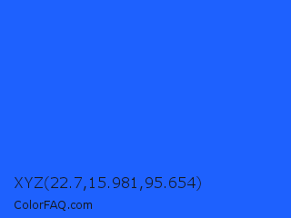 XYZ 22.7,15.981,95.654 Color is a normal blue color and the nearest color is Blue Crayola #1f75fe. Hex code #1e61fe and RGB value is rgb(30,97,254). In RGB color space, this color is composed of 12% red, 38% green, 100% blue, In CMYK color space, this color is composed of 88% cyan, 62% magenta, 0% yellow , 0% black , In HSL color space, this color has a hue angle of 222° , 99% saturation and 56% lightness.