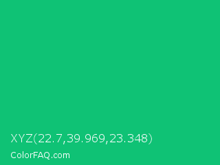 XYZ 22.7,39.969,23.348 Color is a normal green color and the nearest color is Mountain Meadow Crayola #1ab385. Hex code #0fc275 and RGB value is rgb(15,194,117). In RGB color space, this color is composed of 6% red, 76% green, 46% blue, In CMYK color space, this color is composed of 92% cyan, 0% magenta, 40% yellow , 24% black , In HSL color space, this color has a hue angle of 154° , 86% saturation and 41% lightness.