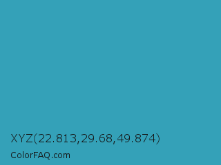 XYZ 22.813,29.68,49.874 Color is a normal cyan color and the nearest color is Pelorous #3eabbf. Hex code #34a1b8 and RGB value is rgb(52,161,184). In RGB color space, this color is composed of 20% red, 63% green, 72% blue, In CMYK color space, this color is composed of 72% cyan, 13% magenta, 0% yellow , 28% black , In HSL color space, this color has a hue angle of 190° , 56% saturation and 46% lightness.
