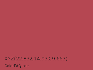 XYZ 22.832,14.939,9.663 Color is a normal red color and the nearest color is English Red #ab4b52. Hex code #b54752 and RGB value is rgb(181,71,82). In RGB color space, this color is composed of 71% red, 28% green, 32% blue, In CMYK color space, this color is composed of 0% cyan, 61% magenta, 55% yellow , 29% black , In HSL color space, this color has a hue angle of 354° , 44% saturation and 49% lightness.