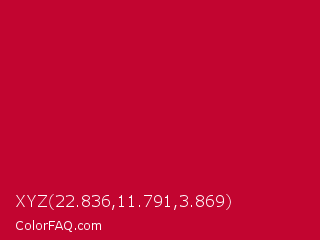 XYZ 22.836,11.791,3.869 Color is a normal red color and the nearest color is Red NCS #c40233. Hex code #c20530 and RGB value is rgb(194,5,48). In RGB color space, this color is composed of 76% red, 2% green, 19% blue, In CMYK color space, this color is composed of 0% cyan, 97% magenta, 75% yellow , 24% black , In HSL color space, this color has a hue angle of 346° , 95% saturation and 39% lightness.