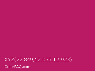 XYZ 22.849,12.035,12.923 Color is a normal rose color and the nearest color is Rose Red #c21e56. Hex code #ba1963 and RGB value is rgb(186,25,99). In RGB color space, this color is composed of 73% red, 10% green, 39% blue, In CMYK color space, this color is composed of 0% cyan, 87% magenta, 47% yellow , 27% black , In HSL color space, this color has a hue angle of 332° , 76% saturation and 41% lightness.