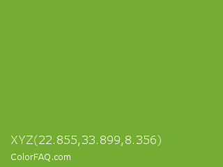 XYZ 22.855,33.899,8.356 Color is a normal green color and the nearest color is Green RYB #66b032. Hex code #75ad32 and RGB value is rgb(117,173,50). In RGB color space, this color is composed of 46% red, 68% green, 20% blue, In CMYK color space, this color is composed of 32% cyan, 0% magenta, 71% yellow , 32% black , In HSL color space, this color has a hue angle of 87° , 55% saturation and 44% lightness.