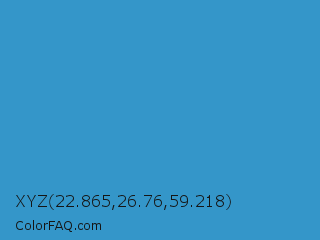 XYZ 22.865,26.76,59.218 Color is a normal blue color and the nearest color is Curious Blue #2596d1. Hex code #3496c9 and RGB value is rgb(52,150,201). In RGB color space, this color is composed of 20% red, 59% green, 79% blue, In CMYK color space, this color is composed of 74% cyan, 25% magenta, 0% yellow , 21% black , In HSL color space, this color has a hue angle of 201° , 59% saturation and 50% lightness.