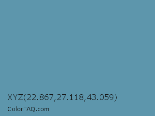 XYZ 22.867,27.118,43.059 Color is a normal blue color and the nearest color is Hippie Blue #589aaf. Hex code #5d96ac and RGB value is rgb(93,150,172). In RGB color space, this color is composed of 36% red, 59% green, 67% blue, In CMYK color space, this color is composed of 46% cyan, 13% magenta, 0% yellow , 33% black , In HSL color space, this color has a hue angle of 197° , 32% saturation and 52% lightness.