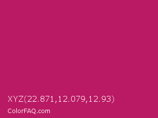 XYZ 22.871,12.079,12.93 Color is a normal rose color and the nearest color is Rose Red #c21e56. Hex code #ba1a63 and RGB value is rgb(186,26,99). In RGB color space, this color is composed of 73% red, 10% green, 39% blue, In CMYK color space, this color is composed of 0% cyan, 86% magenta, 47% yellow , 27% black , In HSL color space, this color has a hue angle of 333° , 75% saturation and 42% lightness.