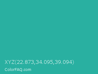 XYZ 22.873,34.095,39.094 Color is a normal cyan color and the nearest color is Light Sea Green #20b2aa. Hex code #29b0a1 and RGB value is rgb(41,176,161). In RGB color space, this color is composed of 16% red, 69% green, 63% blue, In CMYK color space, this color is composed of 77% cyan, 0% magenta, 9% yellow , 31% black , In HSL color space, this color has a hue angle of 173° , 62% saturation and 43% lightness.