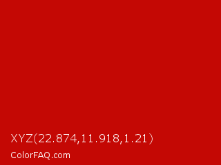 XYZ 22.874,11.918,1.21 Color is a normal red color and the nearest color is Boston University Red #cc0000. Hex code #c40804 and RGB value is rgb(196,8,4). In RGB color space, this color is composed of 77% red, 3% green, 2% blue, In CMYK color space, this color is composed of 0% cyan, 96% magenta, 98% yellow , 23% black , In HSL color space, this color has a hue angle of 1° , 96% saturation and 39% lightness.