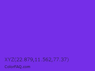 XYZ 22.879,11.562,77.37 Color is a normal violet color and the nearest color is Blue Violet #8a2be2. Hex code #752ee8 and RGB value is rgb(117,46,232). In RGB color space, this color is composed of 46% red, 18% green, 91% blue, In CMYK color space, this color is composed of 50% cyan, 80% magenta, 0% yellow , 9% black , In HSL color space, this color has a hue angle of 263° , 80% saturation and 55% lightness.